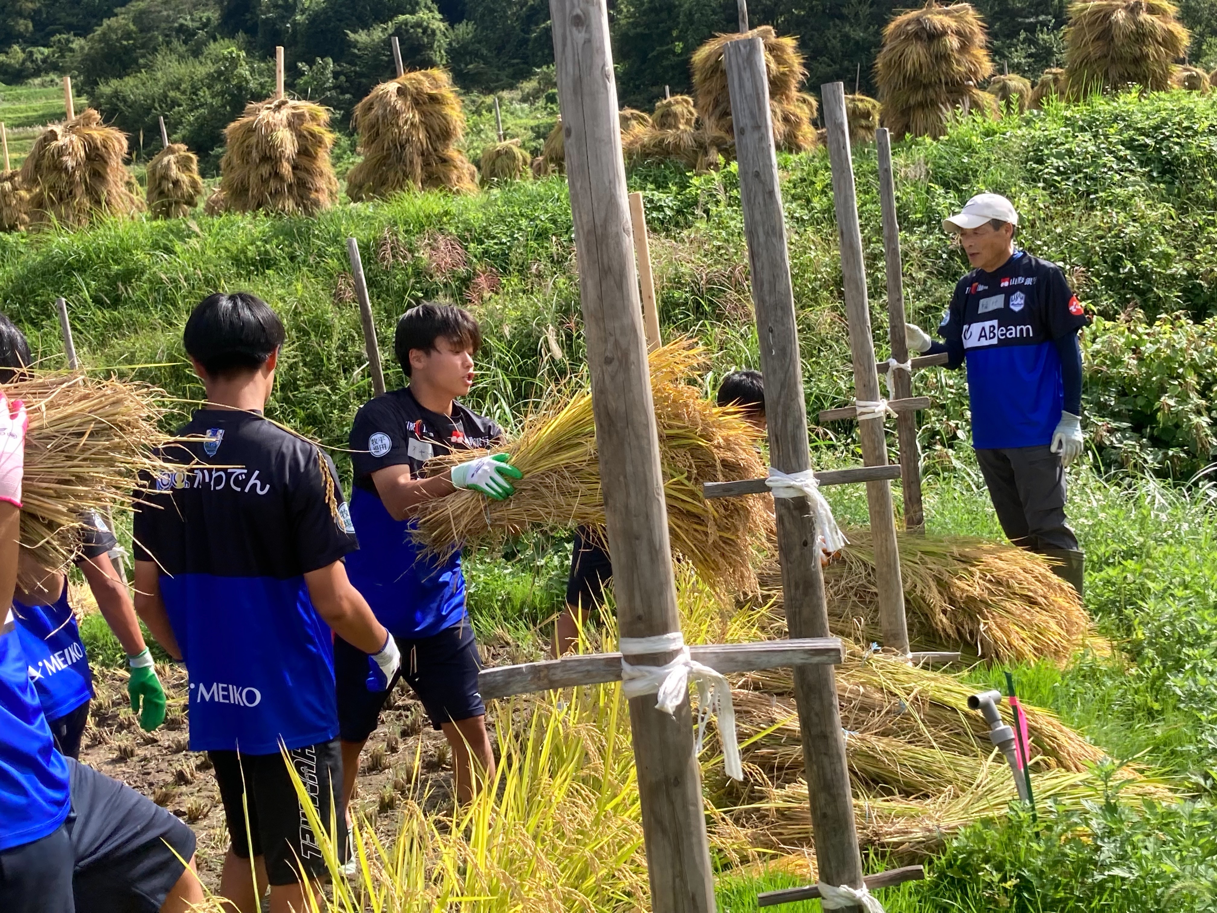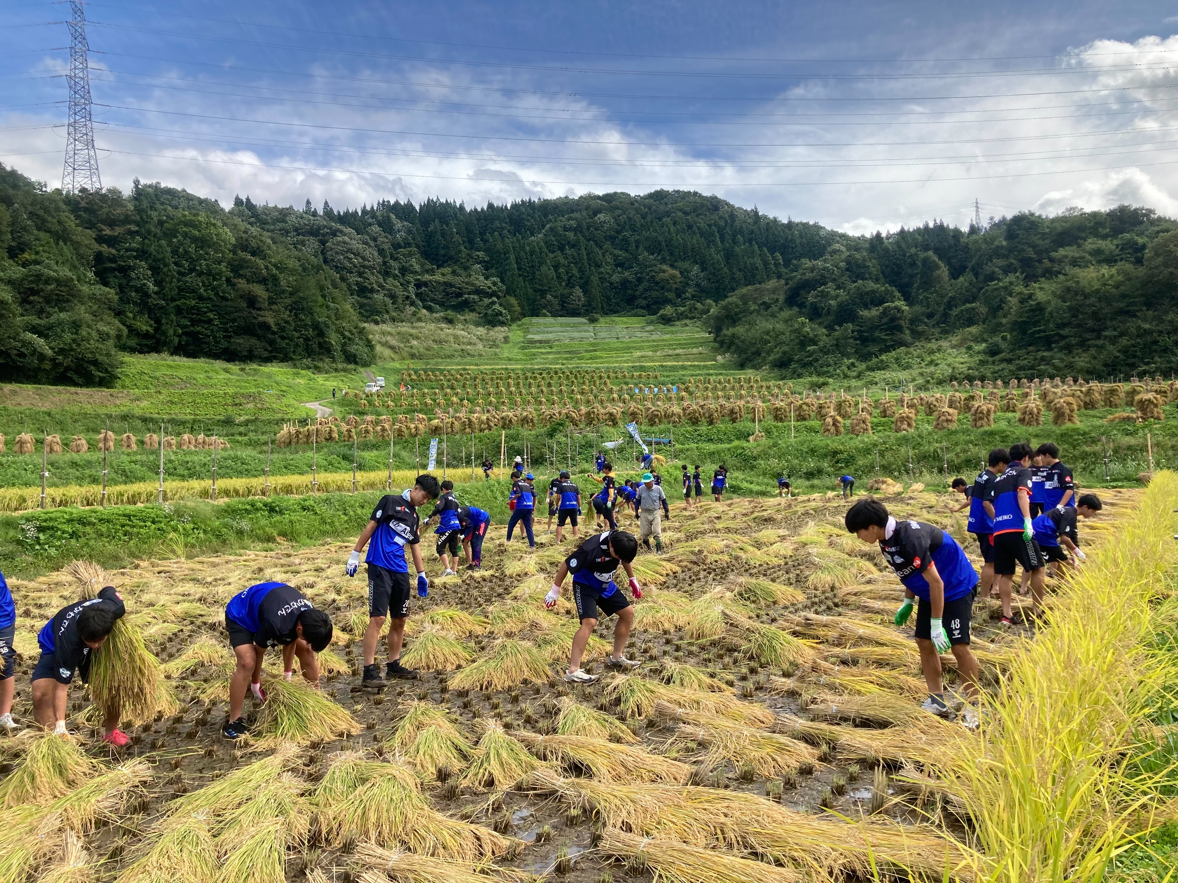 サッカー部60名が参加し、総勢97名の賑やかな稲刈りになりました。
