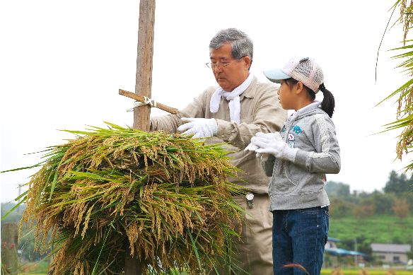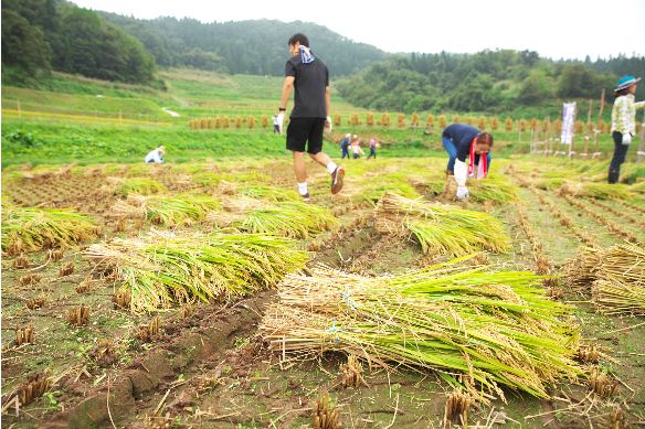 2016年9月27日(火) 2016モンテ棚田米の稲刈り 9月17日(土) 晴れ 95名が参加し、大蕨の棚田では稲刈りを行いました。 地元有志の会の方々の指導のもと、 刈った稲の束を運び、杭に掛けて行く作業。 簡単なようでが、とても体力のいるものでした。 稲杭の稲は三週間ほど天日干しされます。 その間に稲の掛けかえを2〜3回し、 手間ひまを掛け、太陽を燦々と浴びたお米は旨味が増していくのです。 つづく