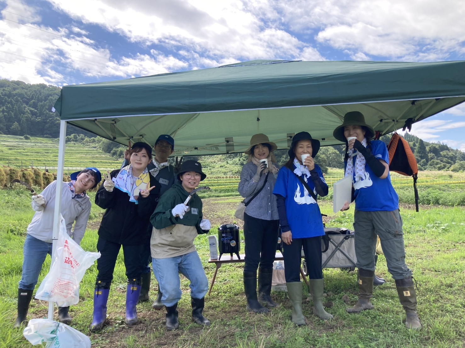 山形交響楽団メンバー、東北農政局、山辺町役場、グループ農夫の会は地元の有志の会の皆さんに指導を受けながら汗を流しました。